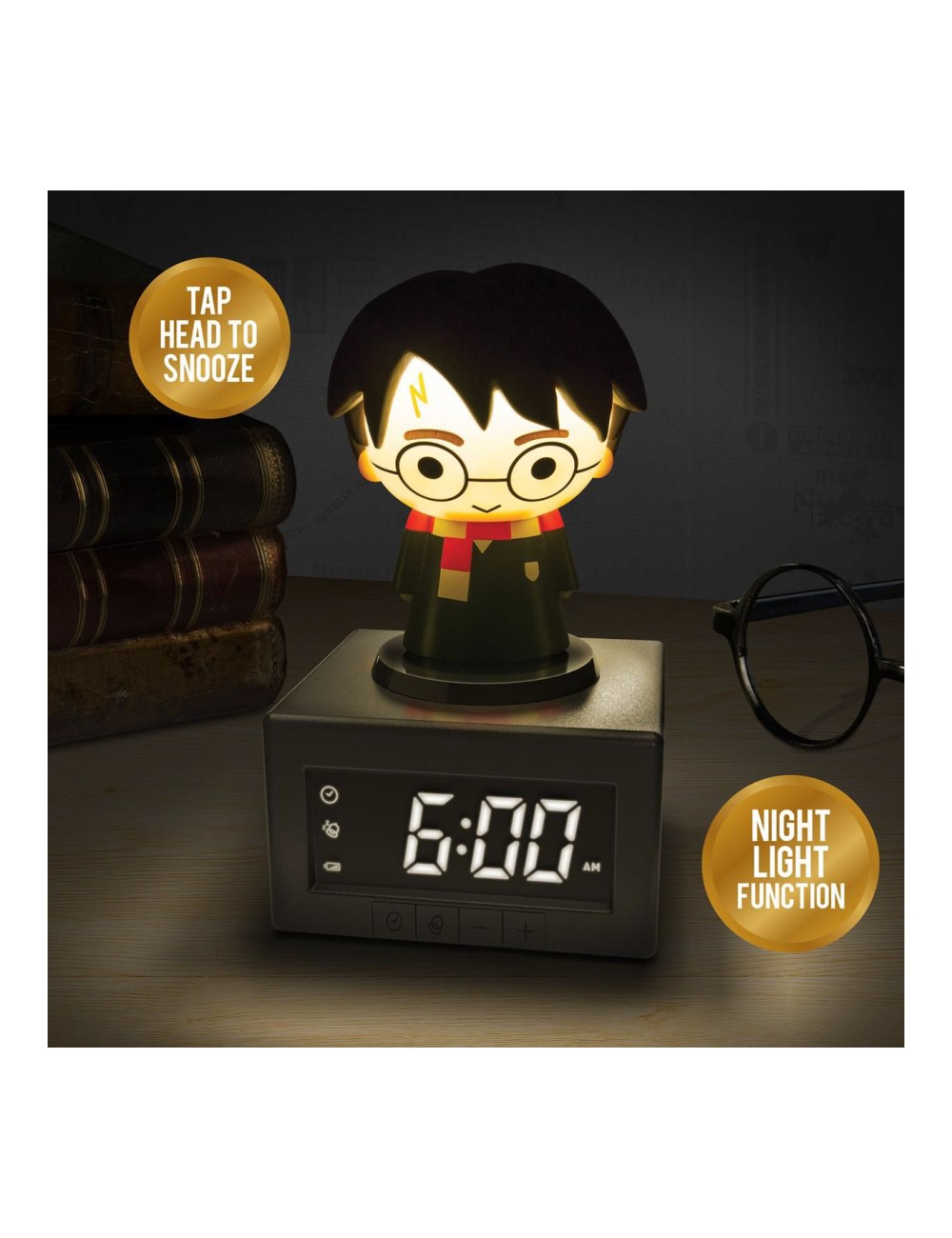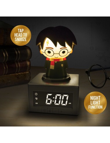 The 17cm (6.7") tall digital alarm clock has a Harry Potter figurine on top of it. Press Harry down to activate the night light and tap his head to snooze the alarm.